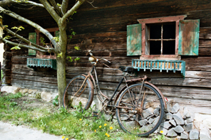 ALTES FAHRRAD AN HOLZHAUS ANGELEHNT